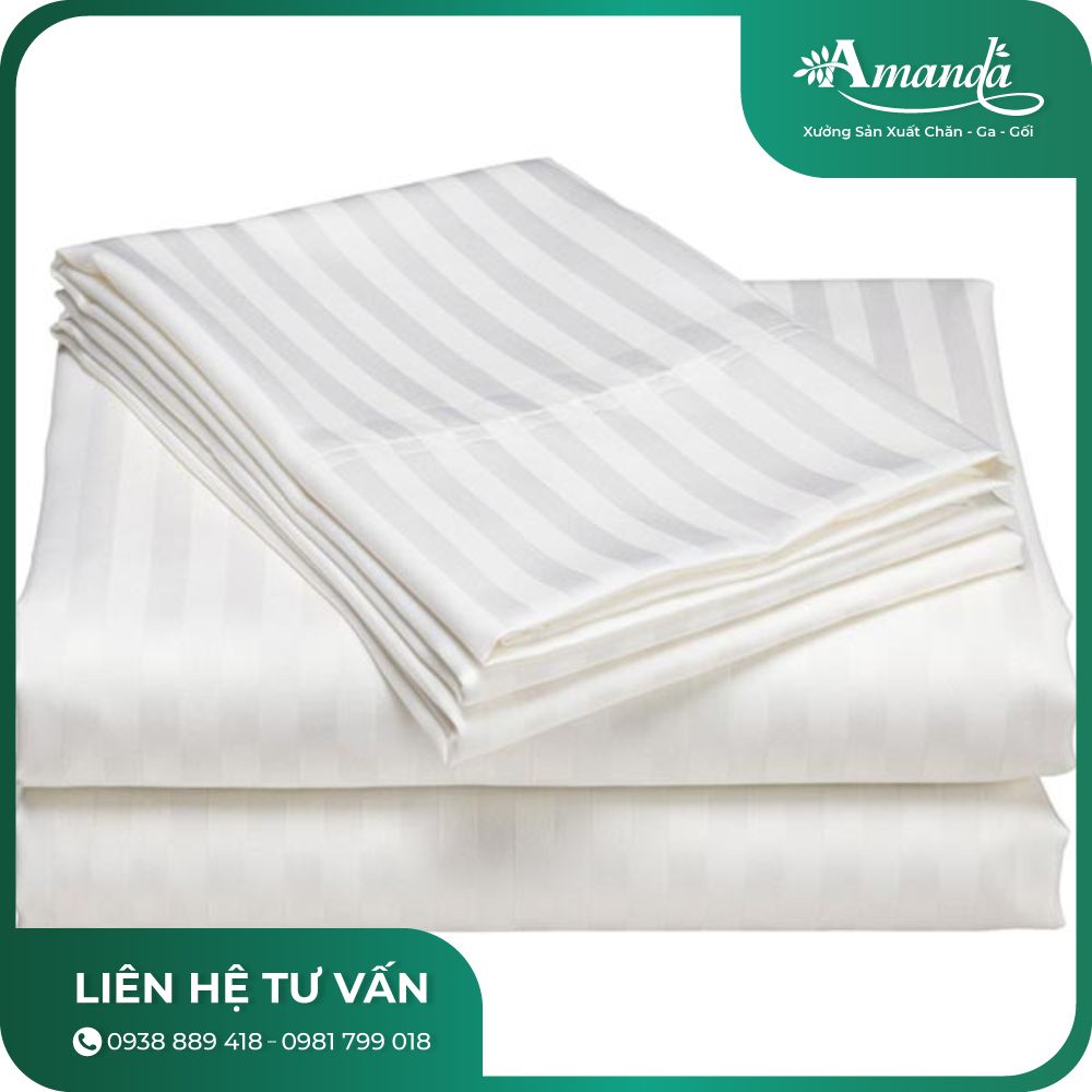Dòng vải CVC T260 có hai lựa chọn phổ biến: trắng trơn và trắng sọc 3cm, mỗi kiểu mang nét đẹp riêng, phù hợp với sở thích và phong cách trang trí khác nhau của khách sạn hoặc homestay.