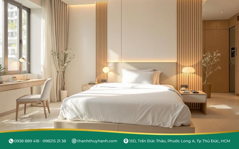 - Màu trắng thanh lịch: Tạo không gian nghỉ ngơi tinh khiết, sang trọng, đúng chuẩn phòng khách sạn 5 sao.