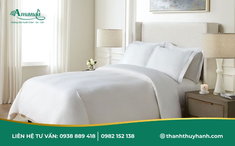 - Cotton 100%: Thoáng mát, thấm hút tốt, mang lại cảm giác mềm mại, dễ chịu cho người nằm. Đây là lựa chọn phổ biến cho các khách sạn từ 2 đến 4 sao nhờ tính năng cân bằng giữa giá thành và trải nghiệm.