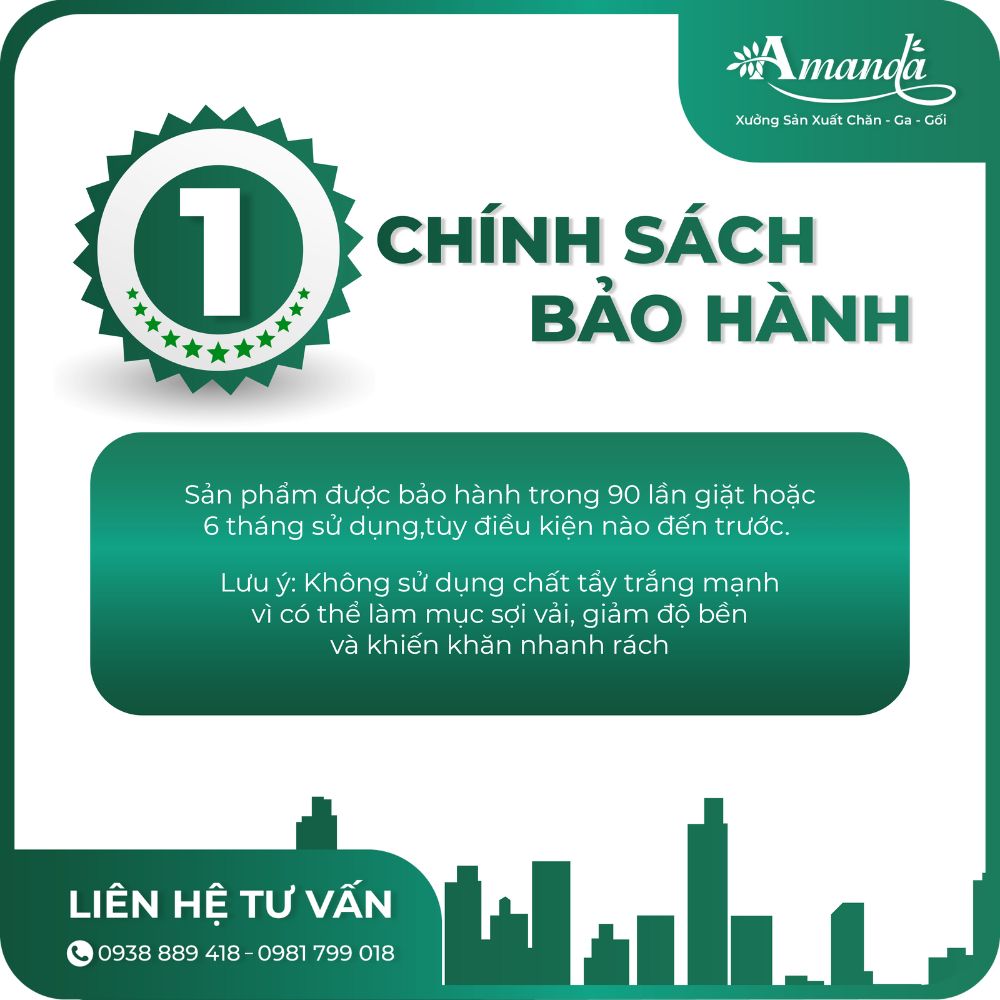 Sản phẩm được bảo hành trong 90 lần giặt hoặc 6 tháng sử dụng (tùy điều kiện nào đến trước). Lưu ý: Không sử dụng chất tẩy trắng mạnh, vì có thể làm mục sợi vải, giảm độ bền và khiến khăn nhanh rách.